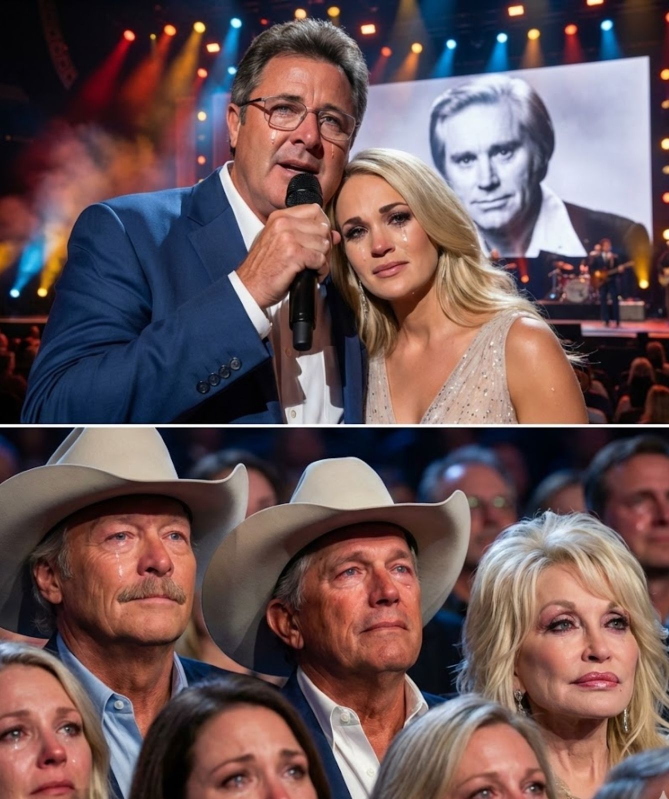 Below the stage sat a gathering few expected. Country legends, artists who had shared stages, studios, and long roads with George, sat quietly with heads bowed. These were not fans witnessing history from afar. These were peers — people who knew the cost of the life he lived and the voice he carried.