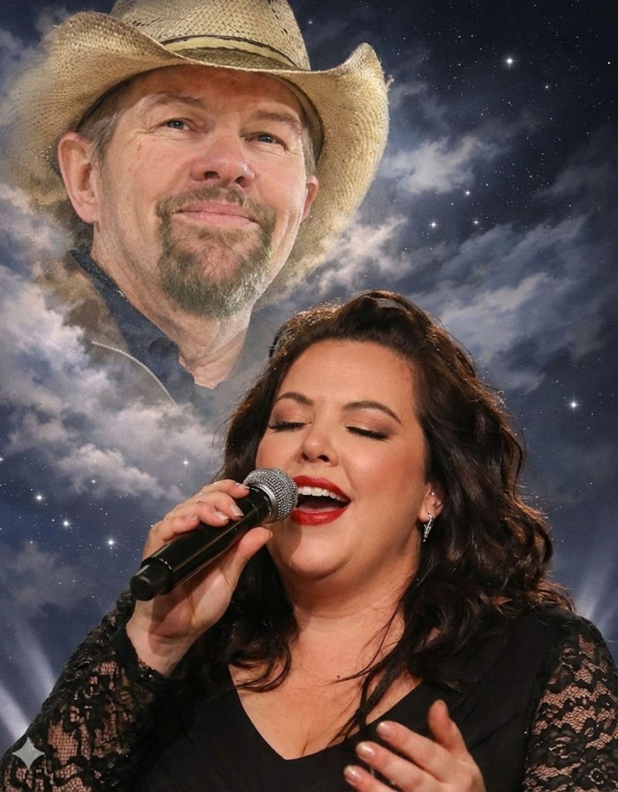 Listeners describe the sensation as overwhelming. It feels as though Toby is suddenly present again — not as memory, not as myth, but as a father standing beside his child, singing one last time. His wisdom wraps around her voice like a final embrace, protective and gentle. Her singing carries everything that was never spoken aloud — every unvoiced “I love you,” every quiet thank-you, every moment that passed too quickly.