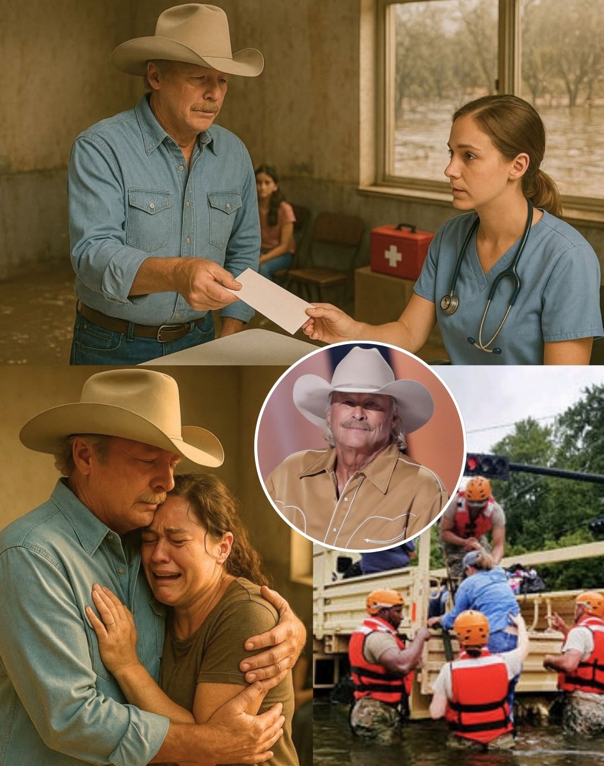 Just Alan Jackson, standing at a flood shelter in Texas — rain-soaked, humble, and silent — slipping an envelope into a nurse’s hand before quietly walking away.