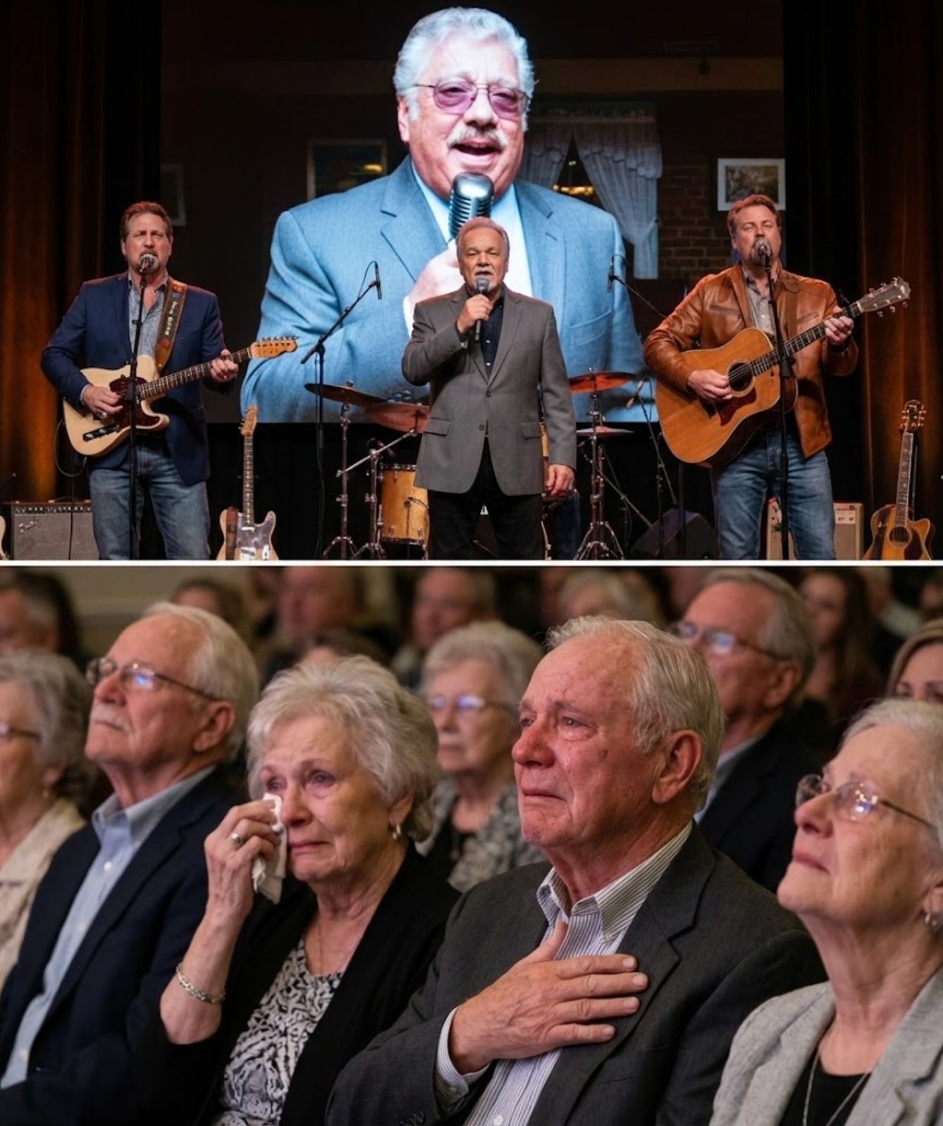 The small venue felt almost reverent, as though it understood what was about to unfold. The lights were soft, not theatrical but tender. No flashing screens. No grand entrance music. Just three men standing together, bound by something deeper than arrangement or rehearsal — bound by memory.