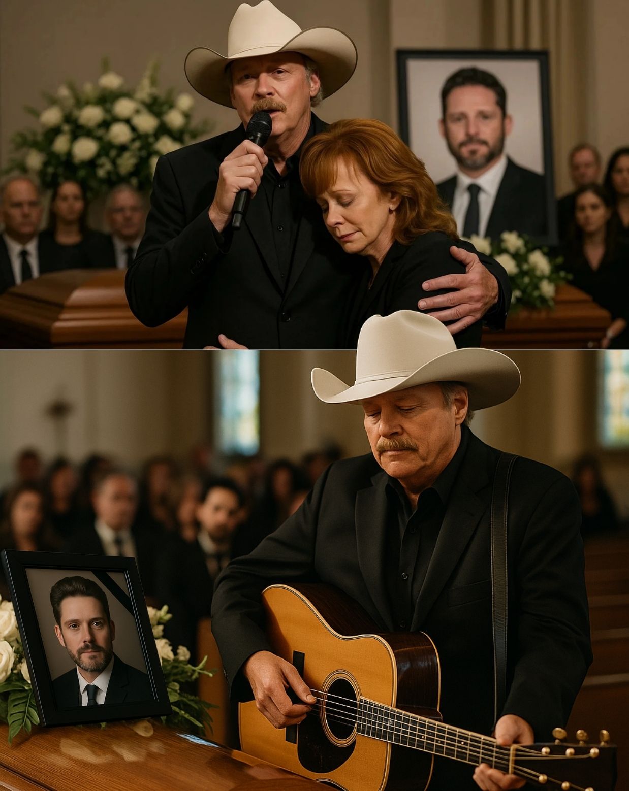 With the quiet reverence of a man who understands the language of grief, Alan stepped beside the casket and took his guitar into his hands. The first warm, aching chords rang out, filling the stillness. There was no applause, no camera flash, no sound beyond those tender notes. The melody seemed to float in the air, wrapping around the mourners, as if to shield them from the sharp edge of loss.