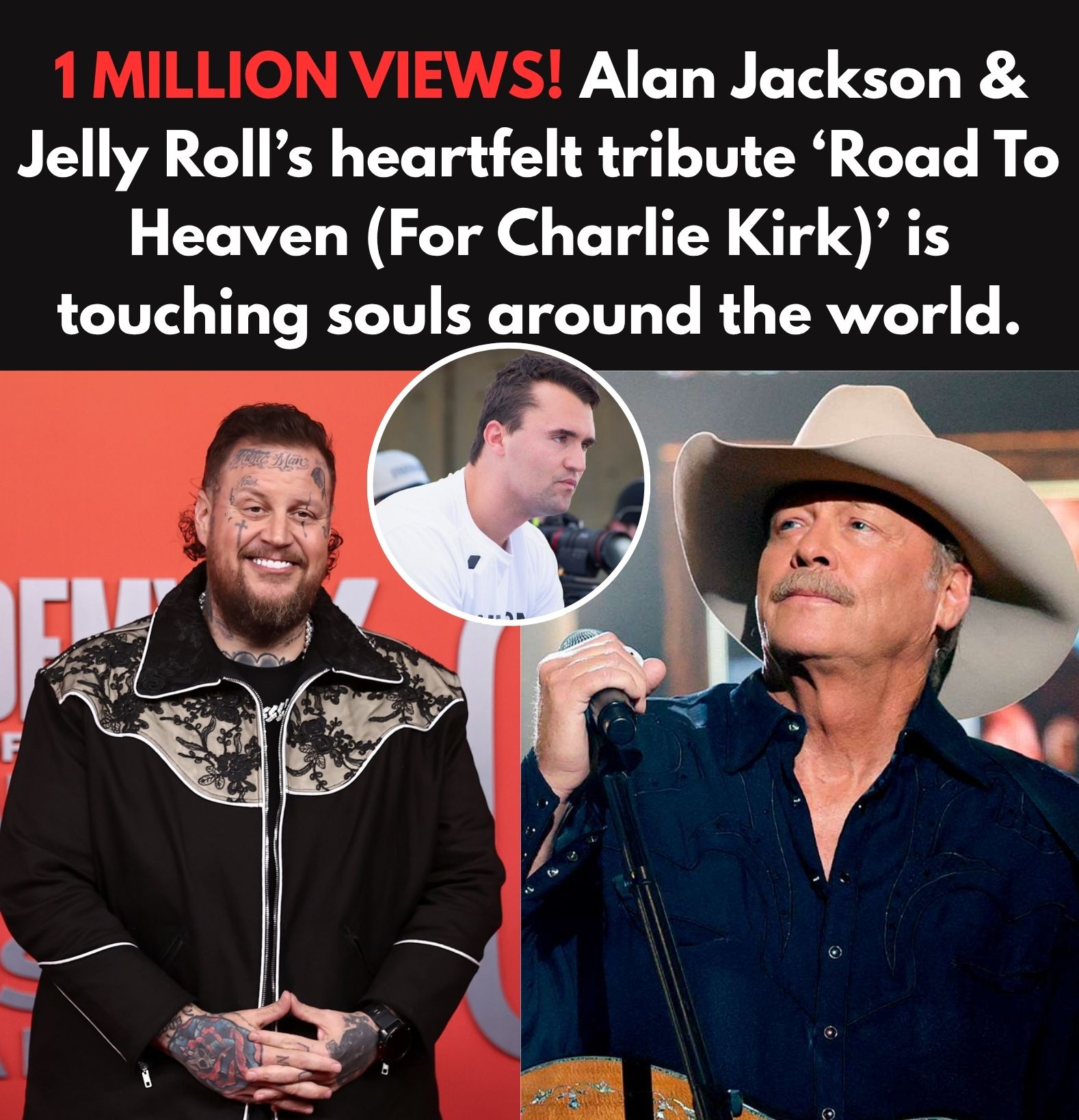 In a world where songs come and go overnight, few melodies manage to touch the heart of an entire generation. Yet this week, Alan Jackson and Jelly Roll did exactly that. Their newly released single, “Road To Heaven (Tribute To Charlie Kirk)”, has taken the music world by storm — surpassing 1 million views within just days of its debut and igniting a wave of emotion across every corner of the globe.