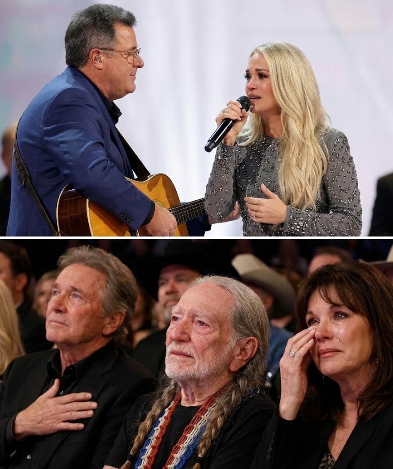The melody unfolded with precision. Carrie’s voice was steady, controlled, and radiant — every note placed where it belonged. Vince stood beside her, grounded and calm, the quiet authority of decades on his shoulders. It felt familiar. Comfortable. Safe. The kind of tribute people expect when legends honor legends.