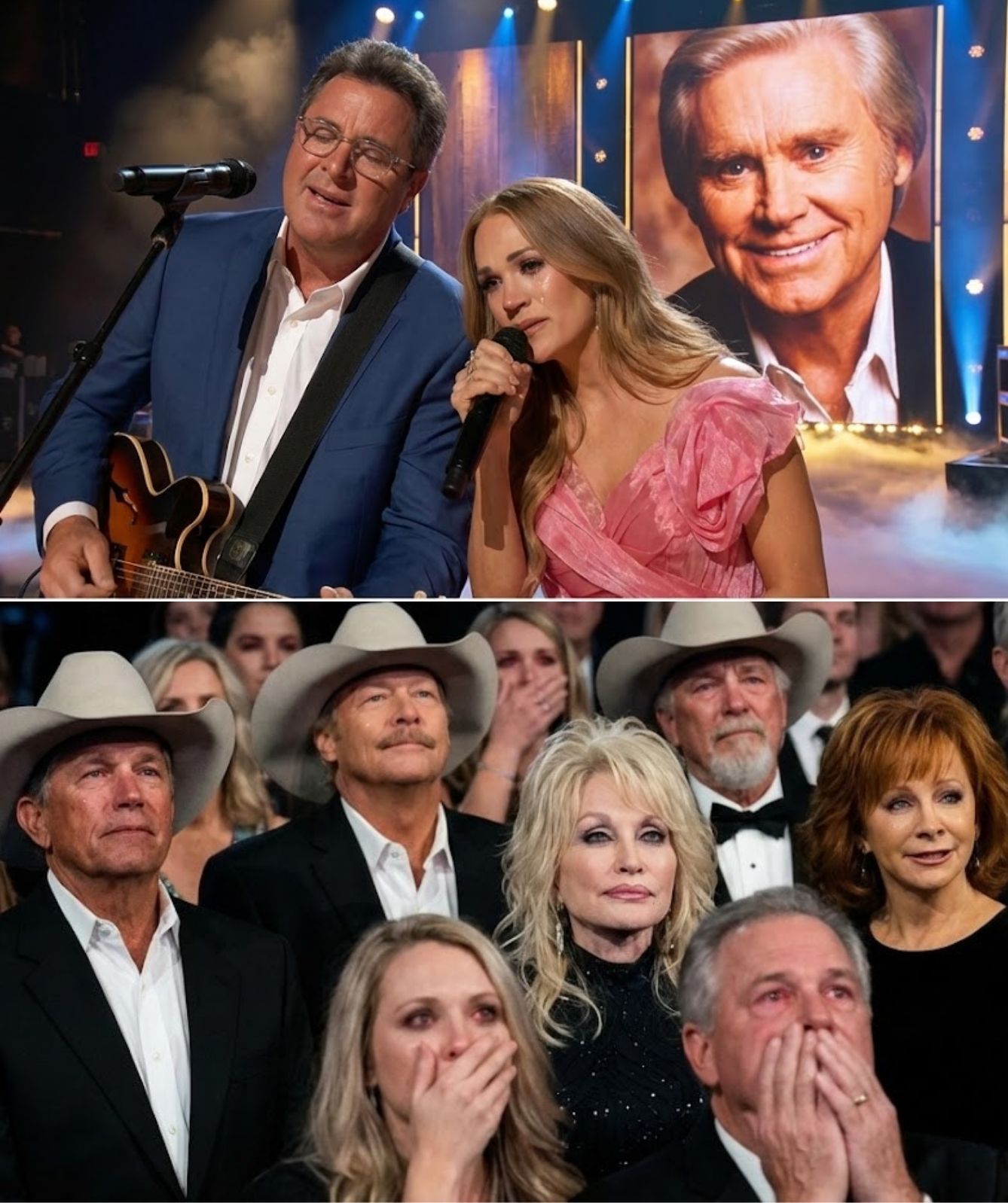 At center stage stood Carrie Underwood, composed and radiant beneath warm, golden lights that softened every edge of the room. Beside her was Vince Gill, steady and attentive, his presence quiet but unmistakable. Together, they looked exactly as everyone expected legends to look when honoring another legend.