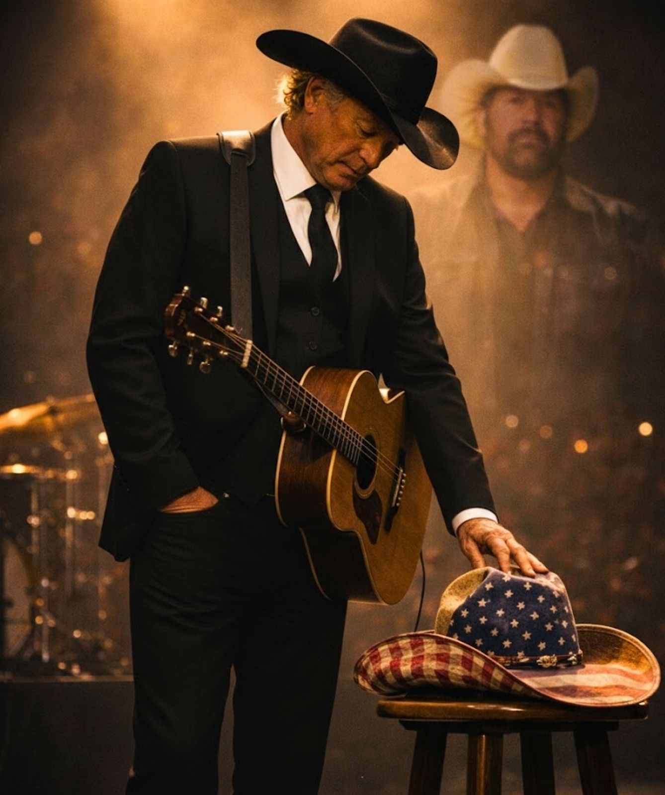 Resting nearby was an object that carried more meaning than any plaque or award ever could — the American-flag cowboy hat Toby had worn so often it no longer felt like clothing. It felt like a statement. A conviction. A quiet vow to never forget who he was or where he stood. The hat did not sparkle under the lights. It didn’t need to. Its power came from the life it represented.