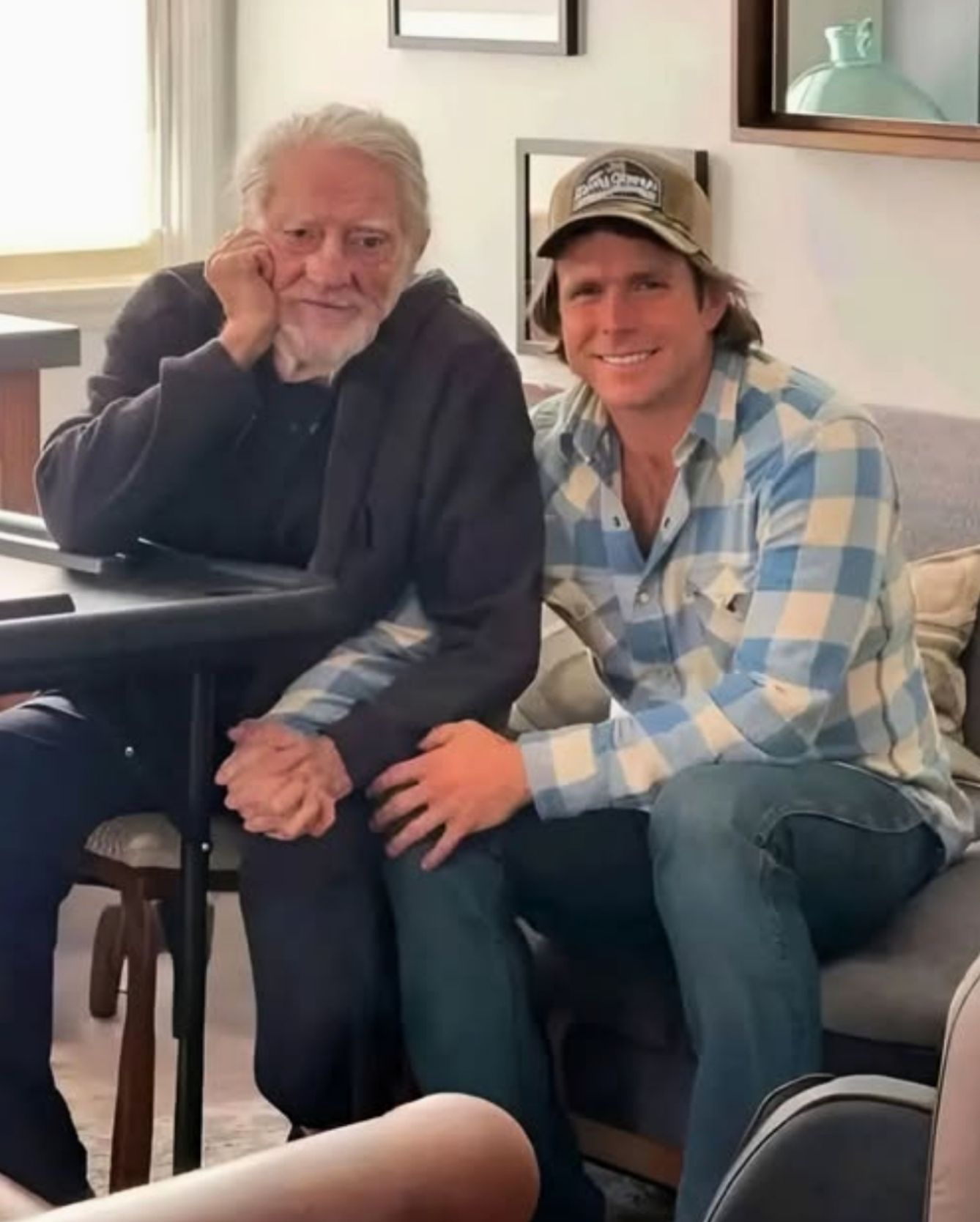 By his side sat his son, Lukas Nelson. Grown now, with a career and a voice of his own, Lukas carried both the pride of independence and the weight of inheritance. On this afternoon, he did not come as a performer for the world, but as a son for his father. He reached over and placed a hand on Willie’s knee, wrapping his fingers around his father’s weathered hand. To hold those fingers was to hold more than skin and bone — it was to hold the memory of a nation, the sound of songs that had defined generations.