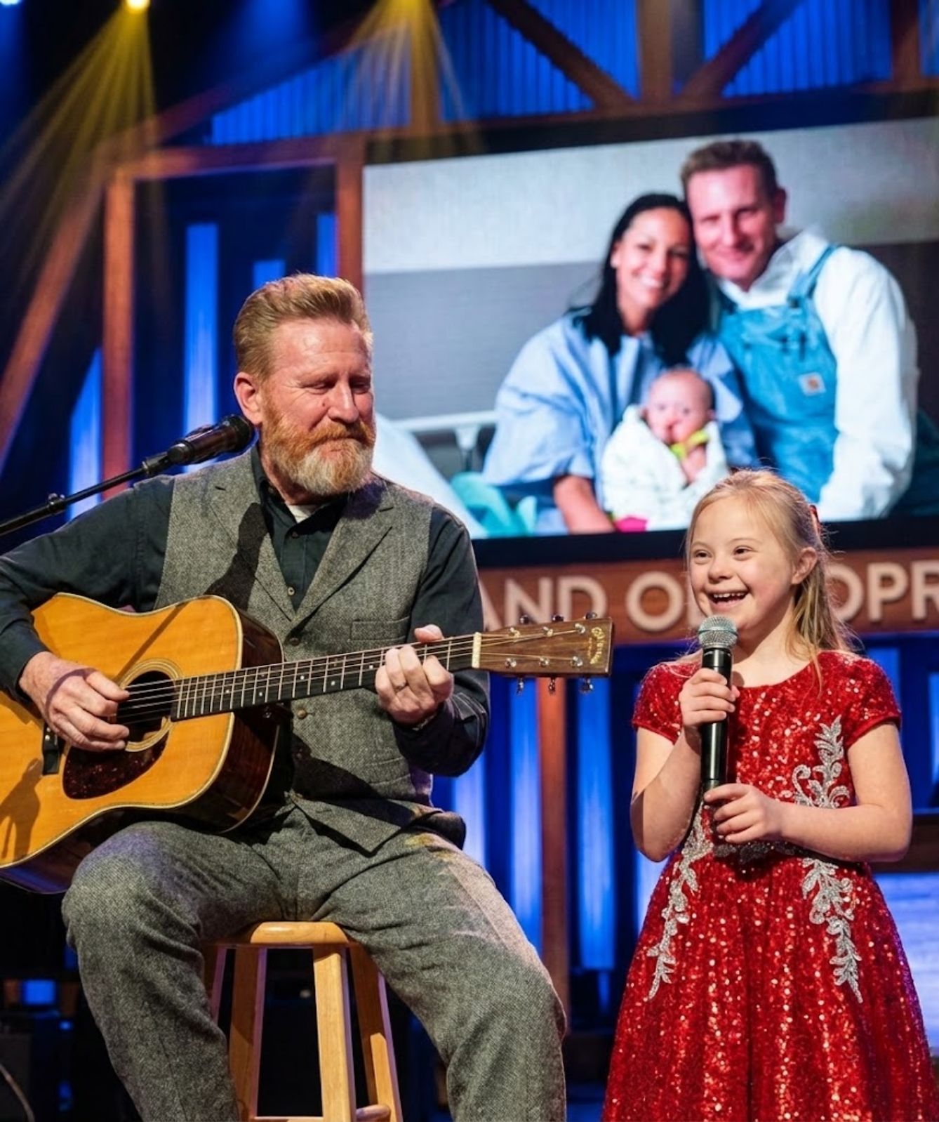 As the song unfolded, it became clear that this was more than a tribute. It was a bridge across generations. A daughter carrying a mother’s voice. A father witnessing love continue beyond absence. A song returning to the very place where country music was born and reborn countless times before.