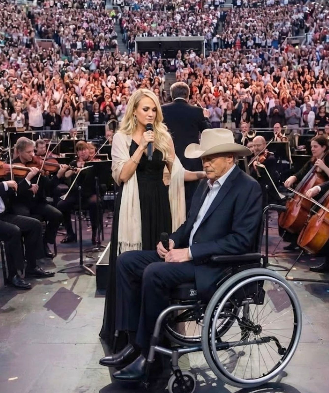 When Carrie Underwood stepped into the spotlight, there was no roaring introduction to announce her presence. No dramatic swell of strings or flashing beams sweeping across the crowd. She walked forward with quiet composure, her expression steady, her gaze settling gently on Alan Jackson, seated alone at center stage.