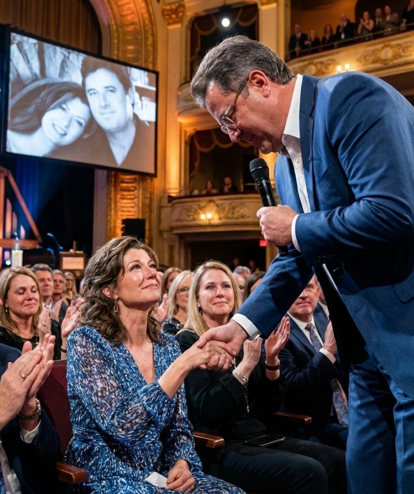 Seated quietly among the audience was Amy Grant. No spotlight followed her. No announcement acknowledged her presence. She was simply there — listening the way you do when a song already knows your life, when the lyrics no longer feel written but remembered.