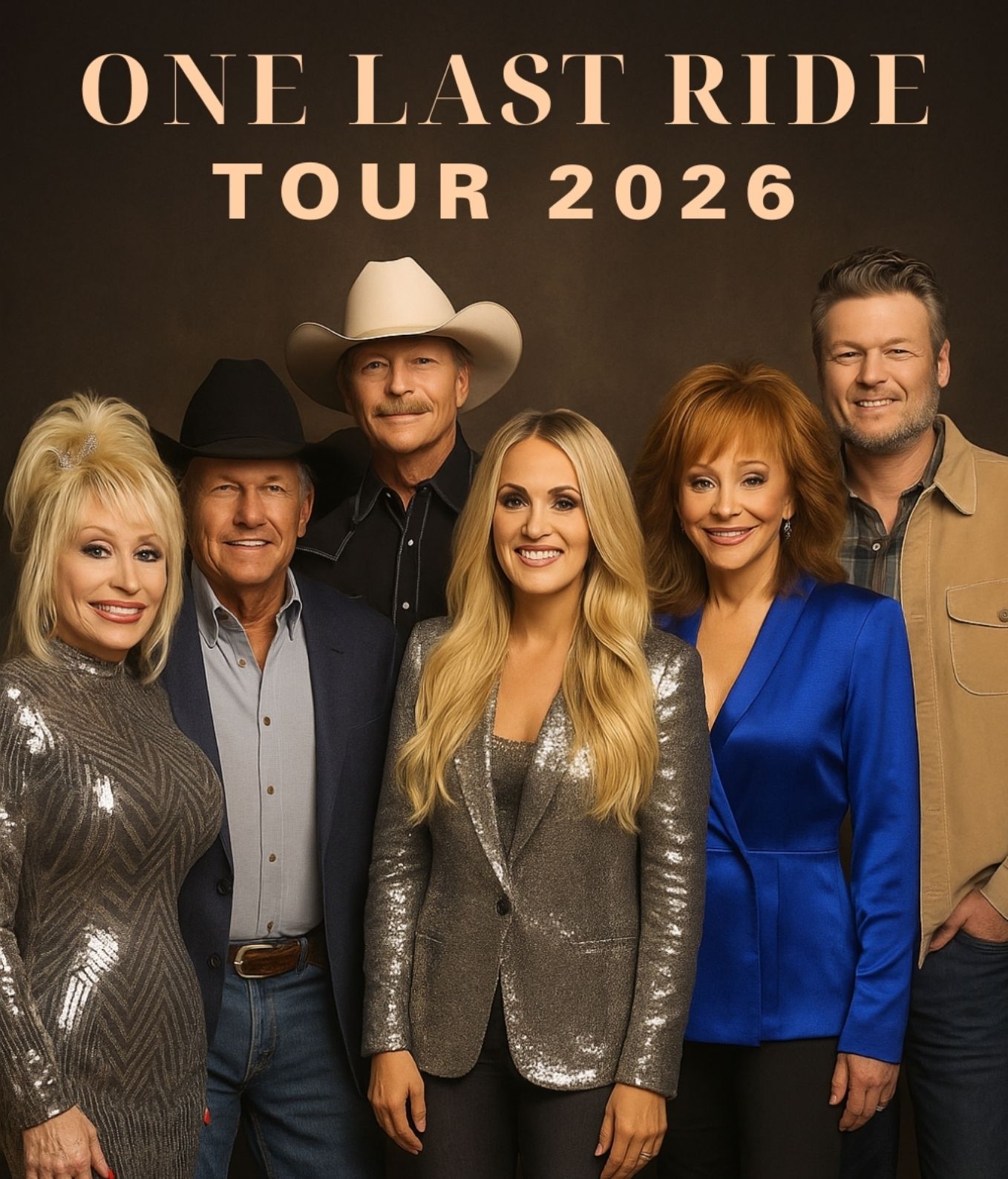 Some moments are concerts. Others are history. In 2026, country music will witness the latter when six of its most beloved voices unite for a farewell tour already being hailed as a once-in-a-lifetime event. Dolly Parton, George Strait, Alan Jackson, Carrie Underwood, Reba McEntire, and Blake Shelton will share the stage for “One Last Ride” — a final journey that promises to be both a celebration and a benediction.