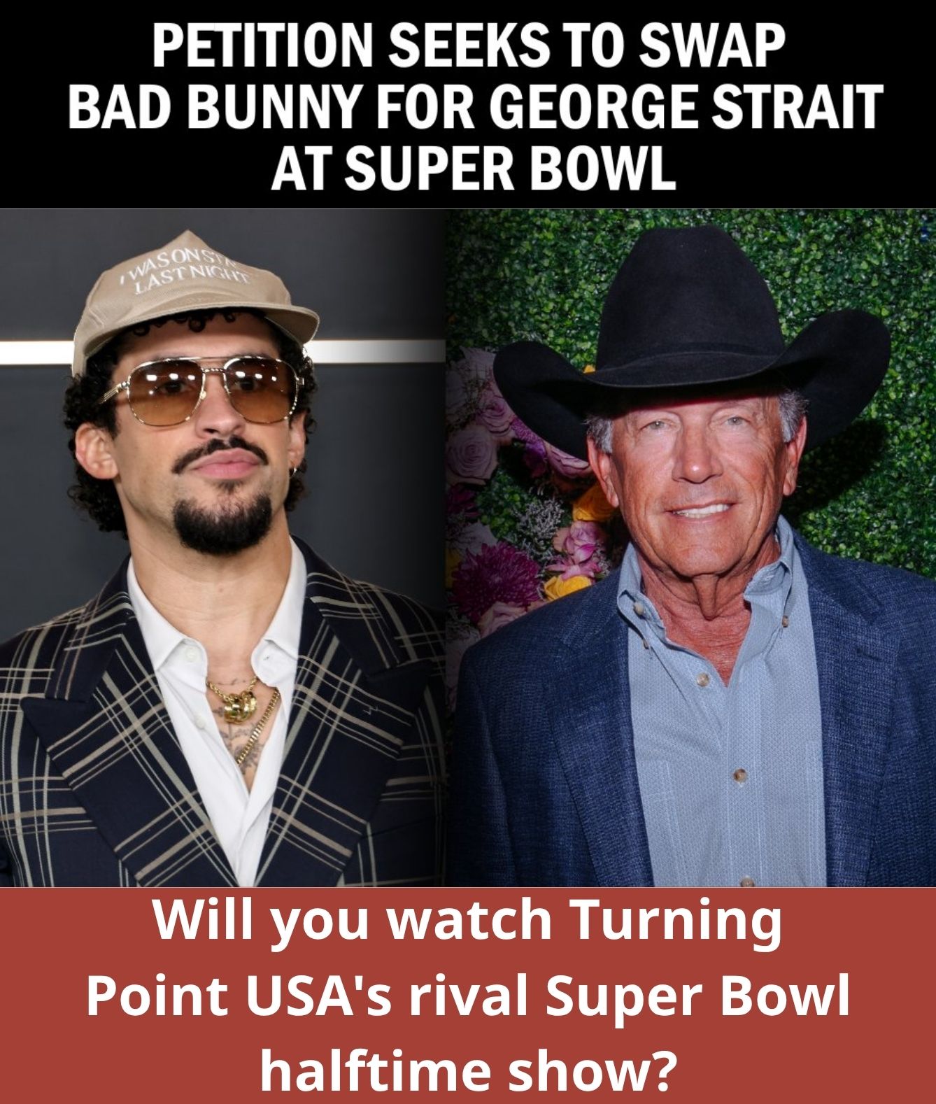 What began as a small outcry on social media has now exploded into a full-blown cultural movement. Across America, from Nashville honky-tonks to Texas rodeo towns, country music fans are uniting behind a viral petition demanding that George Strait headline the Super Bowl LX halftime show — instead of Puerto Rican rapper Bad Bunny.