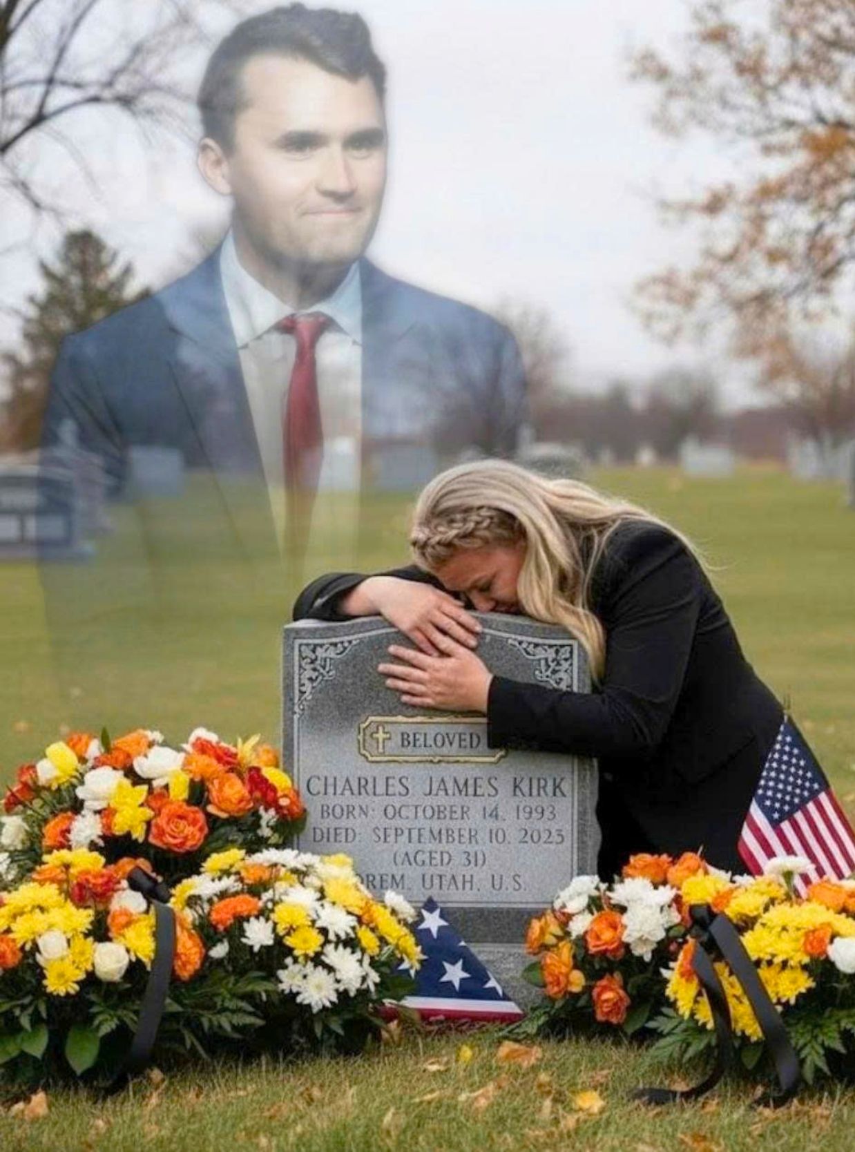 On a moonlit night heavy with wind and memory, she returned to his grave. The air was cold, the ground still damp from an earlier rain. There, before the marble carved with his name — CHARLIE KIRK — she fell to her knees, her tears cutting through the quiet like rain on stone.