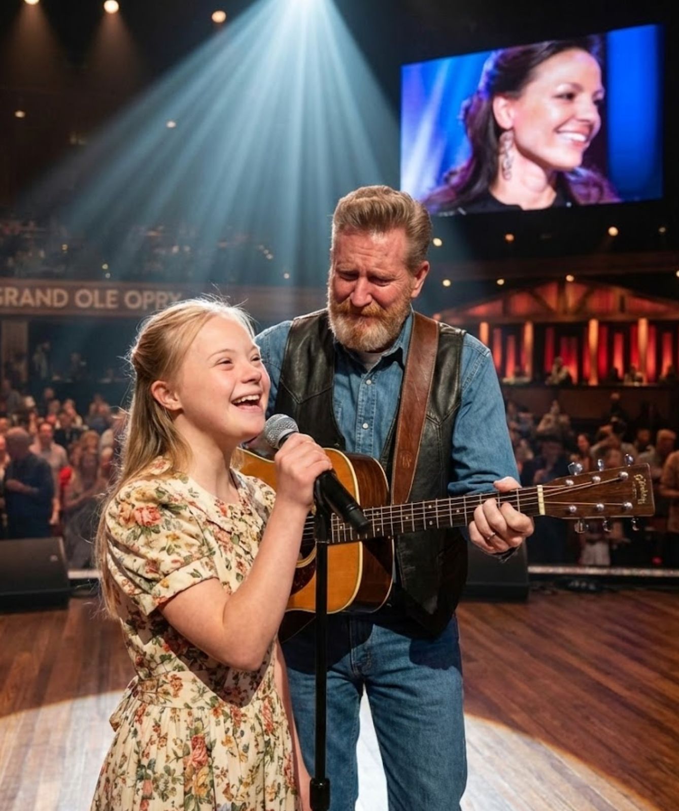 Under the familiar lights of the Opry stage, Rory Feek stood frozen, not as a performer, but as a father. Beside him stood his 11-year-old daughter, Indiana Feek—small in stature, yet carrying something far greater than nerves or stage presence. She was carrying memory, love, and a song that had never truly left the building.