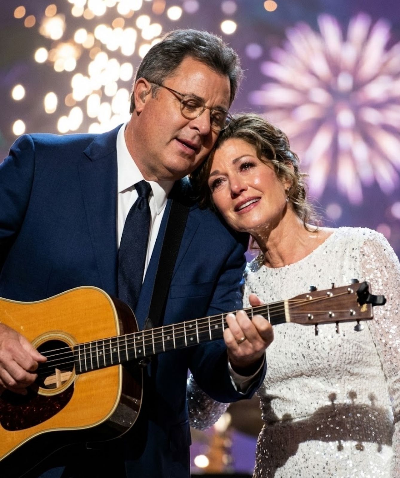 As the final minutes of the year slipped away, the arena softened. Lights dimmed to a warm glow. Conversations fell silent. Somewhere between the ticking clock and the held breath of thousands, Vince lifted his guitar — and his fingers trembled on the strings. Not from nerves, but from knowing the truth of the moment. Amy leaned into him, close enough to share the quiet, close enough to share the courage it takes to be fully present when hearts are open.