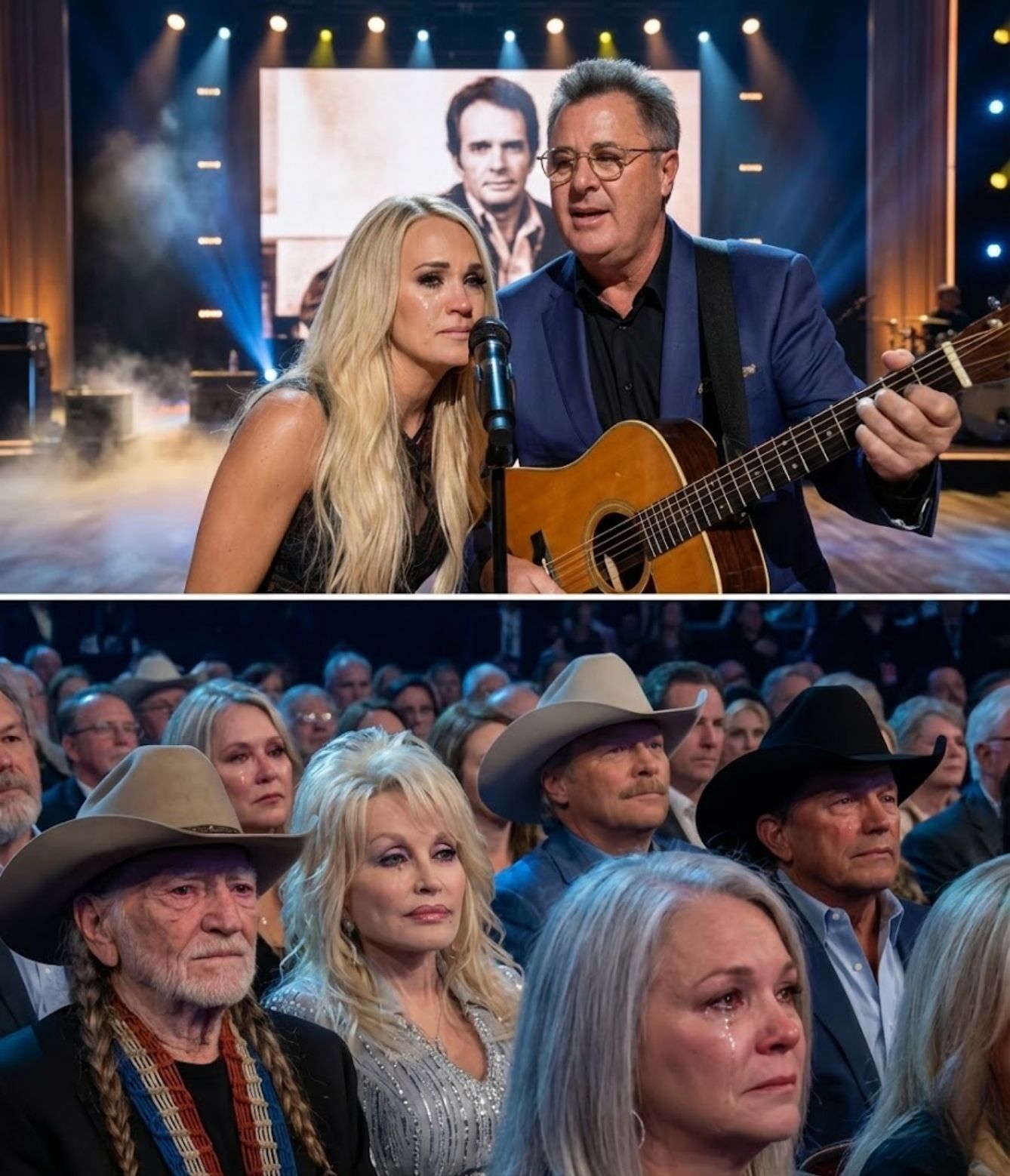 They stood frozen — not because they were unsure of what to do next, but because there was nothing to add. Their stillness felt deliberate, almost ceremonial, as if Merle Haggard himself had stepped forward unseen, drawn a line across the air, and said, that’s enough.