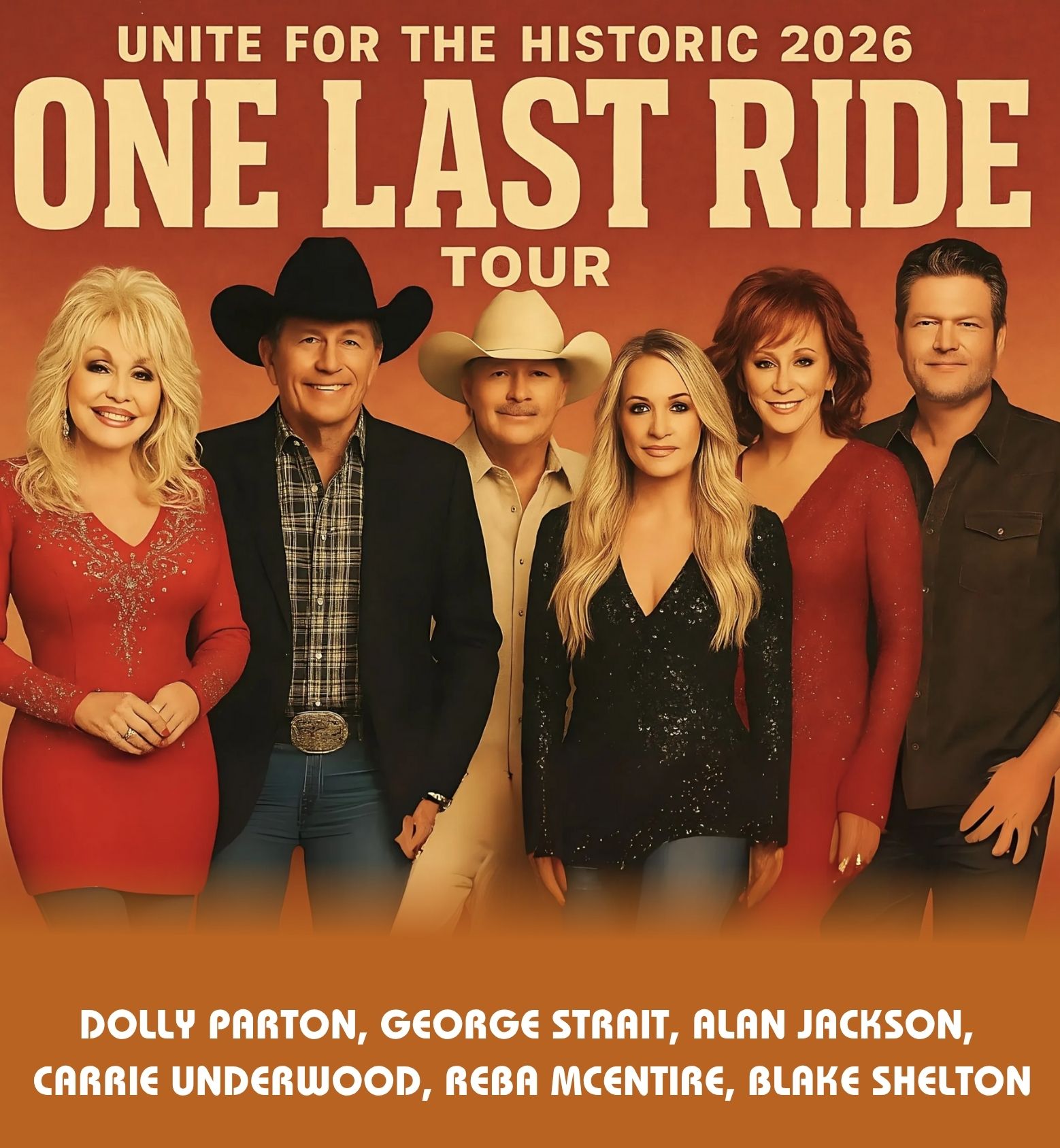 It is the moment country music fans both dreamed of and dreaded — the official announcement of “One Last Ride” (2026), a farewell tour unlike any other. Six voices that have defined generations — Dolly Parton, George Strait, Alan Jackson, Carrie Underwood, Reba McEntire, and Blake Shelton — will stand shoulder to shoulder for one last journey across America’s stages.