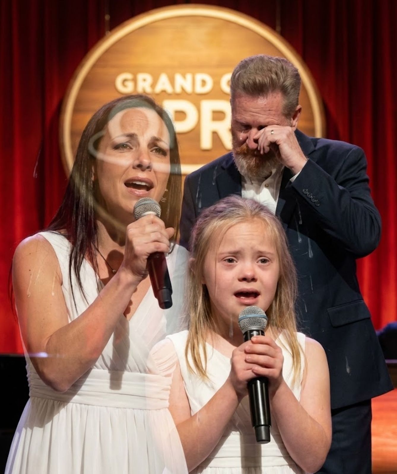 Tears streamed down his face, unchecked, as his daughter sang on. This was not simply pride. This was not sorrow alone. It was the overwhelming collision of past and present — an impossible bridge of love stretching across time. His heart, already shaped by years of devotion and loss, seemed unable to hold the fullness of what he was witnessing.