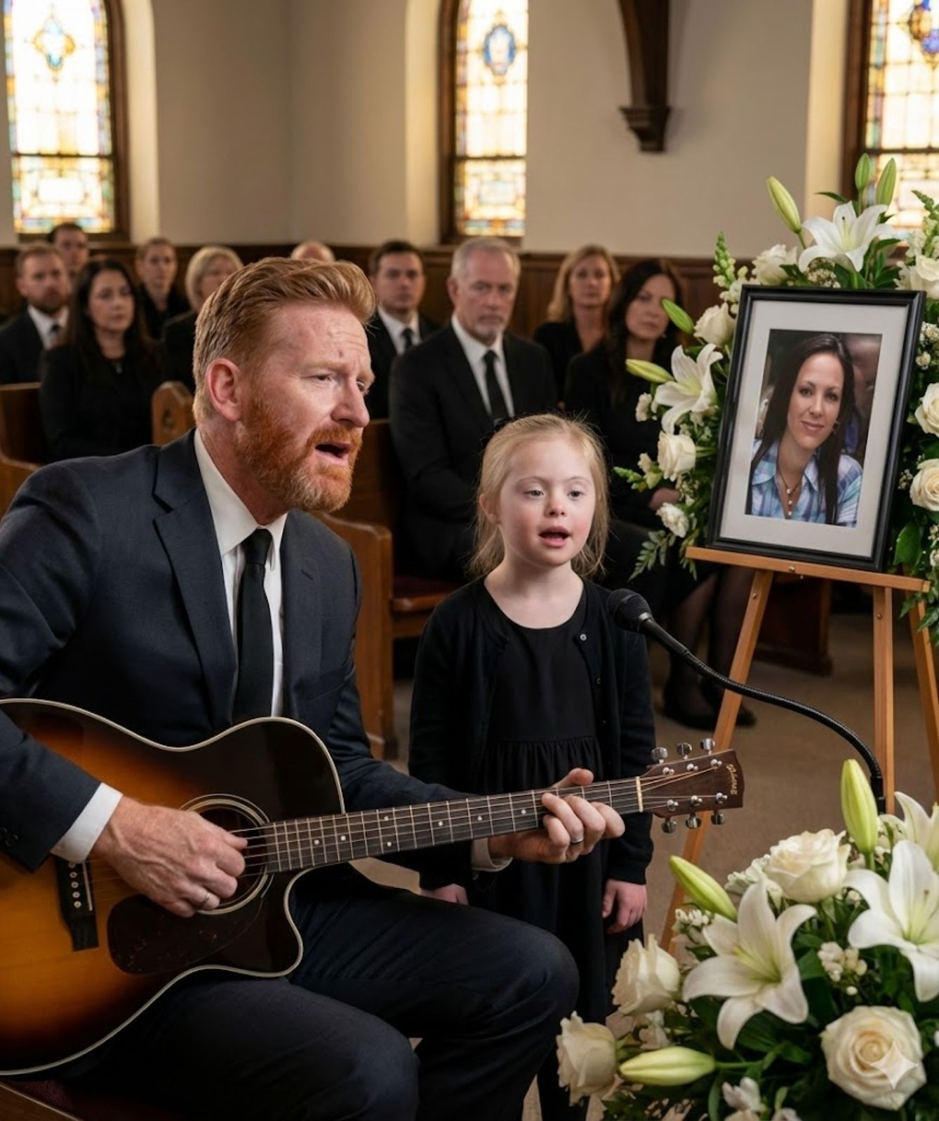 Inside the church, the air was heavy with reverence. There were no hurried conversations, no restless movements. Only the shared understanding that grief does not expire with time — it simply learns how to sit beside us. At the front of the room stood Rory Feek, steady yet visibly changed, and beside him, his precious daughter Indiana Feek — small in stature, yet carrying a strength far beyond her years.