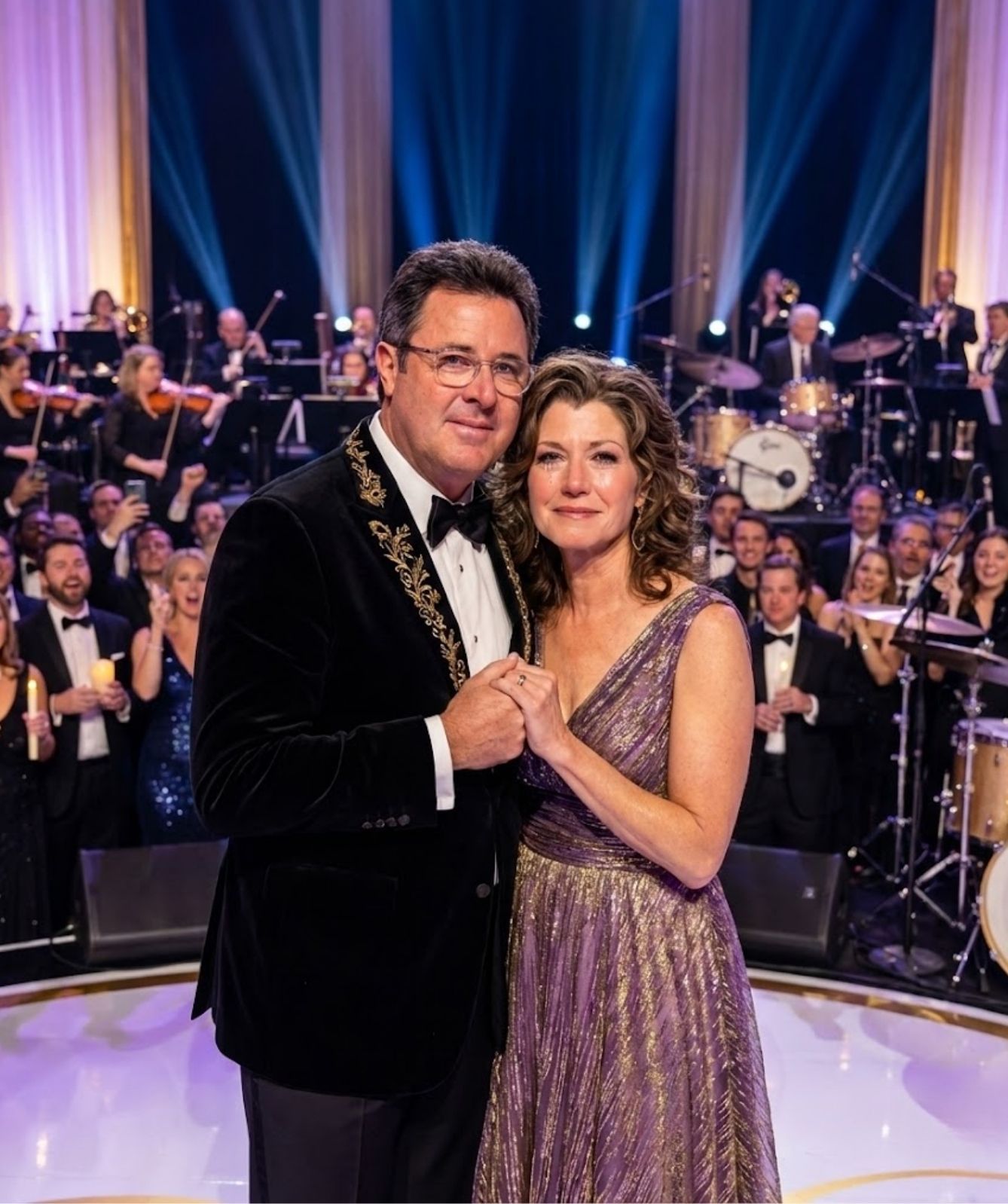 Vince turned slightly toward Amy during a quiet line, his timing and tone wrapping around hers with care. It was the sound of partnership — not only in marriage, but in faith and purpose. Amy smiled through tears, steady and present, her voice lifting the room without ever leaving the ground beneath it. The legends around them did not compete; they converged, creating a harmony that felt less like a chorus and more like a gathering of hearts.