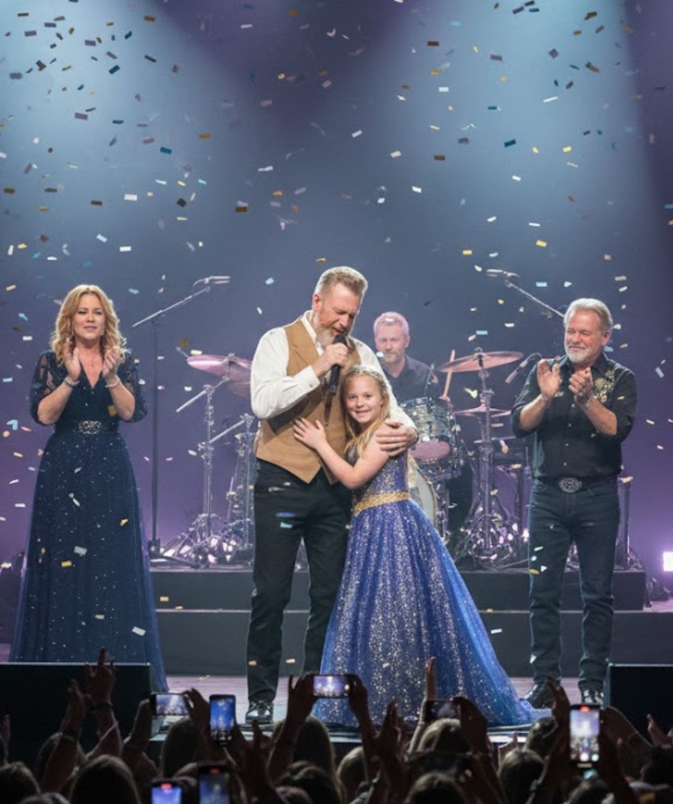 The stage was vast. The crowd immense. Country music legends stood nearby in respectful stillness, not as performers, but as witnesses. And yet, the moment felt intimate — as if the world had shrunk down to a father, a daughter, and a song waiting to be born.