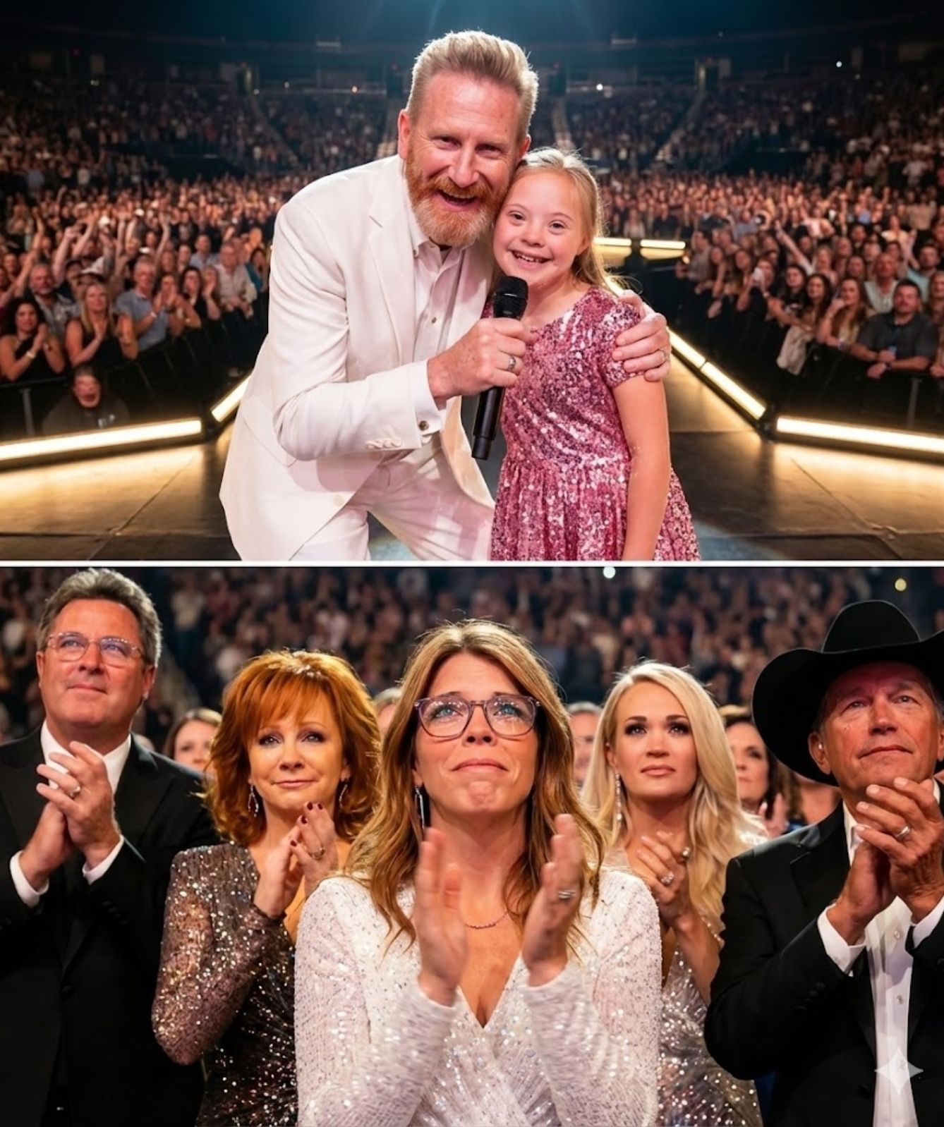 The instrument did not lead; it embraced. The chords wrapped around Indiana’s melody like warm sunlight, steady and protective, the way a father’s presence steadies a child when the world feels big. Rory’s voice followed — low, lived-in, grateful — carrying years of love, loss, and faith without weighing the song down. The harmony did something rare: it lifted.