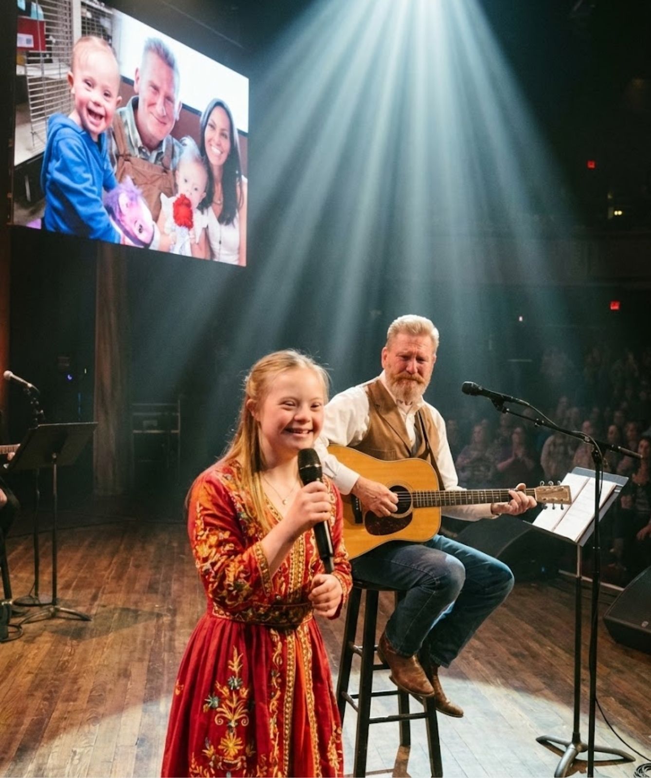 The famous wood beneath her feet — worn smooth by history — seemed to listen. Every footstep that had crossed it before felt present, gathered into the moment. It was as though the Opry itself remembered.