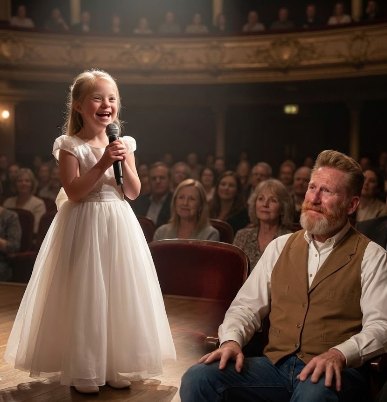 She looked small under the lights, yet somehow unshaken. There was no showmanship in her stance. No rehearsed confidence. Only purpose, quiet and sincere. This was not a child chasing applause. This was a daughter carrying something sacred.