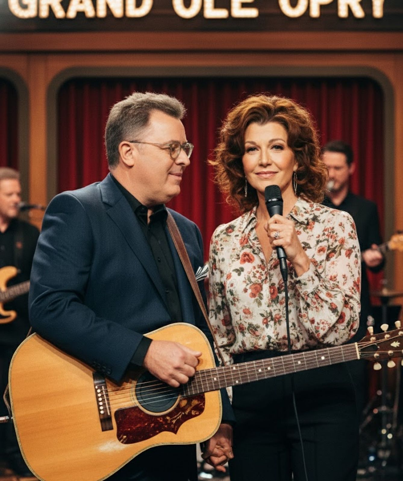 What followed was not simply harmony. It was collision — of lives shared quietly offstage, of faith lived privately, of voices shaped by different roads that somehow knew exactly how to meet. Vince’s voice carried its familiar warmth and restraint. Amy’s arrived luminous and steady, carrying clarity that cut straight through the room.