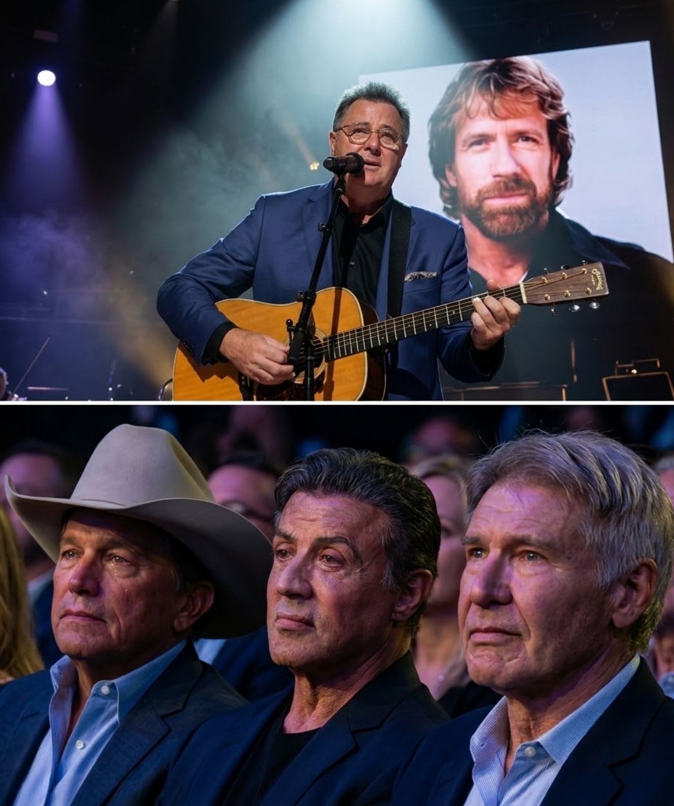 Across the room, familiar faces reflected the same quiet surrender. George Strait lowered his head, his shoulders rising and falling as he struggled to hold steady. There was no attempt to conceal the emotion — no effort to maintain distance. In that moment, he was not a legend, but a man feeling the same weight as everyone else.
