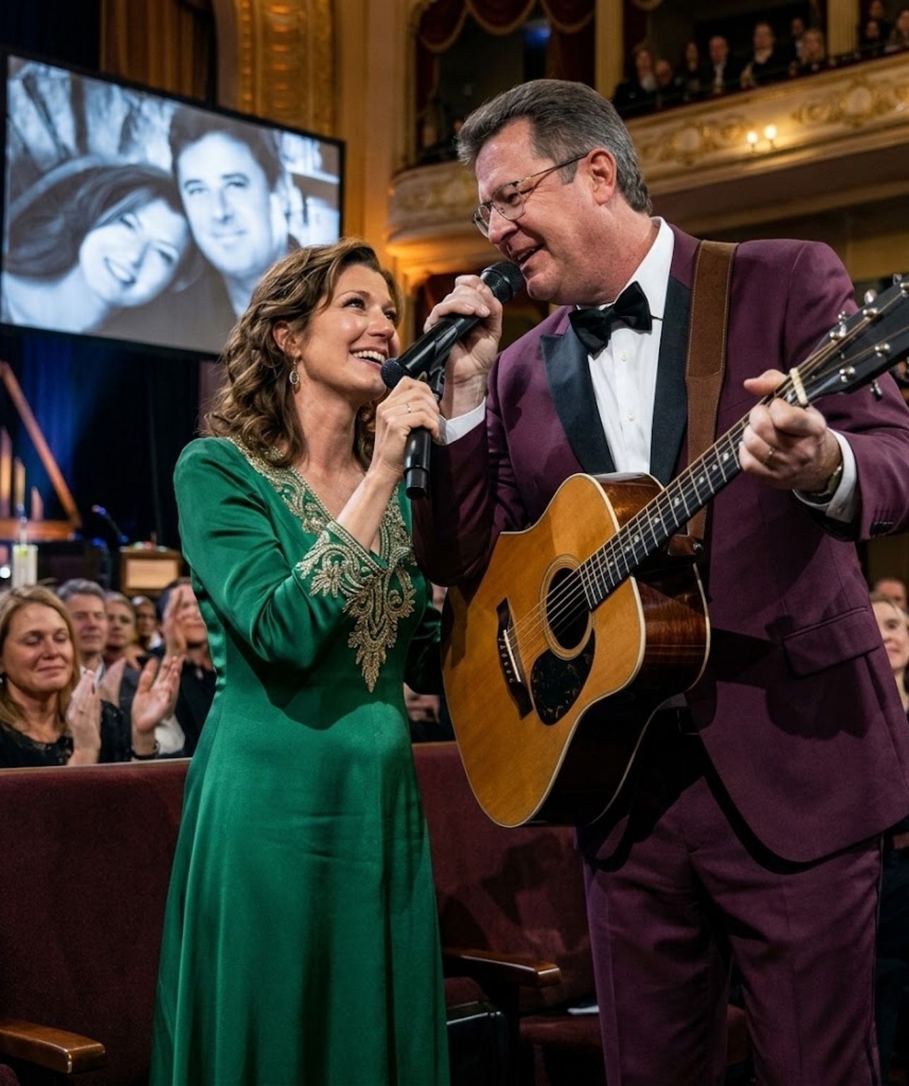 Amy’s tone moved through the room like soft evening light spilling across old wooden floors. Gentle yet steady, her voice seemed to lift Vince’s words and carry them into every corner of the hall. His rich, familiar warmth blended with her tenderness in a way that felt almost effortless, as though the song had always been waiting for this exact moment.