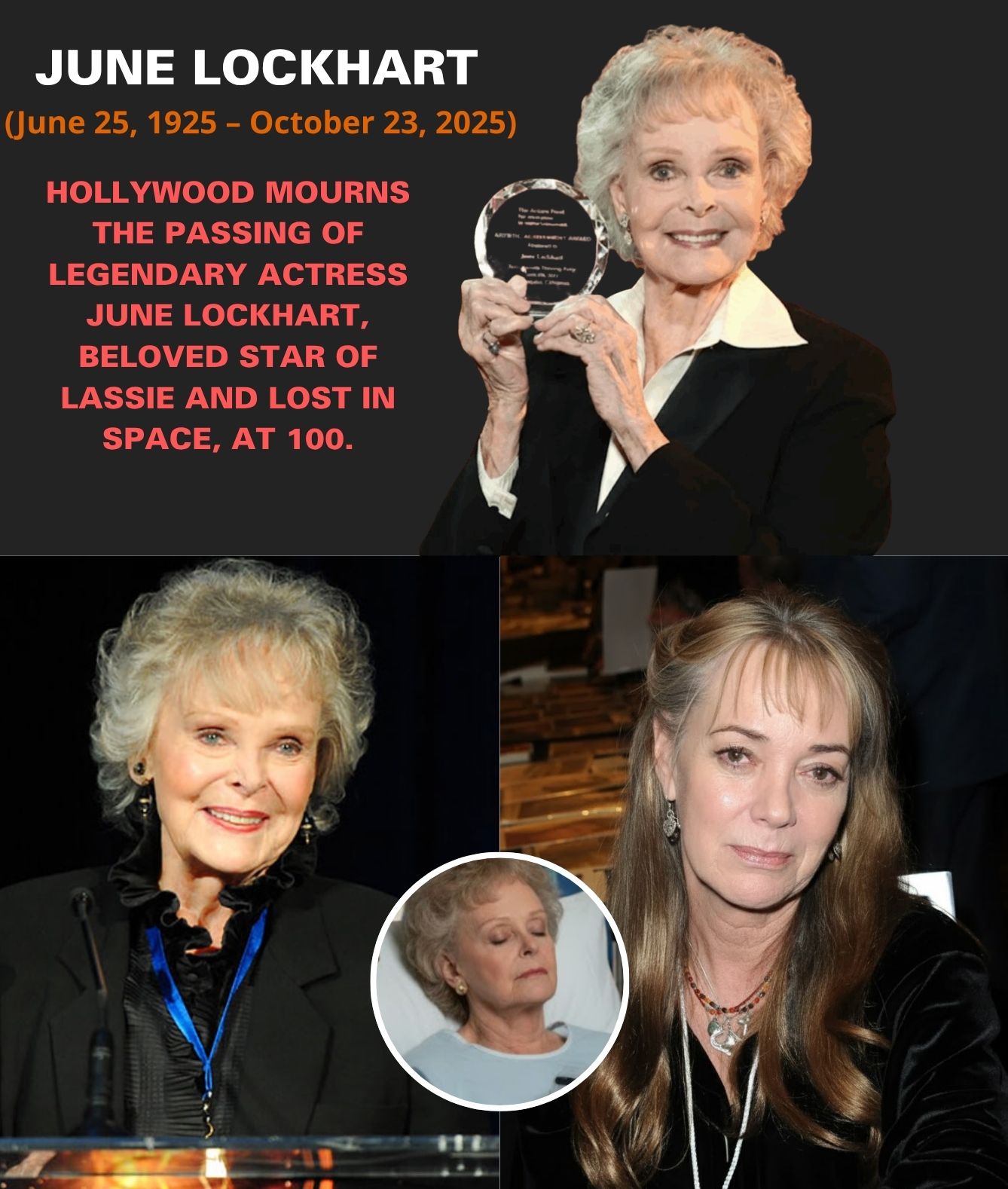 Hollywood is in mourning tonight as the curtain falls on one of its most timeless and beloved stars. June Lockhart, whose career spanned more than eight decades, passed away peacefully at the age of 100, surrounded by family and love. Her daughter, Anne Lockhart, tearfully confirmed the news, saying her mother’s final words were “filled with grace, gratitude, and peace.”