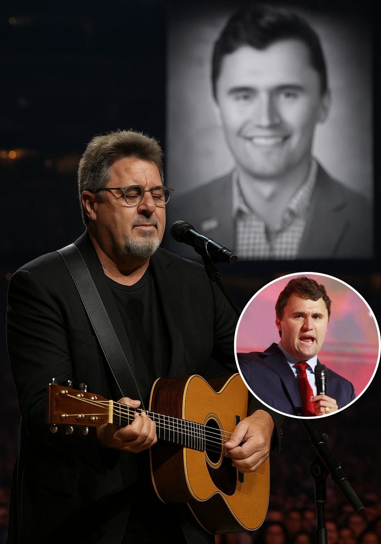 Without a word, Vince lowered his head, strummed a single trembling chord, and began to sing. The sound was fragile yet resolute — a raw, heartfelt tribute to Charlie Kirk, whose sudden death at just 31 had left family, friends, and a nation in shock.
