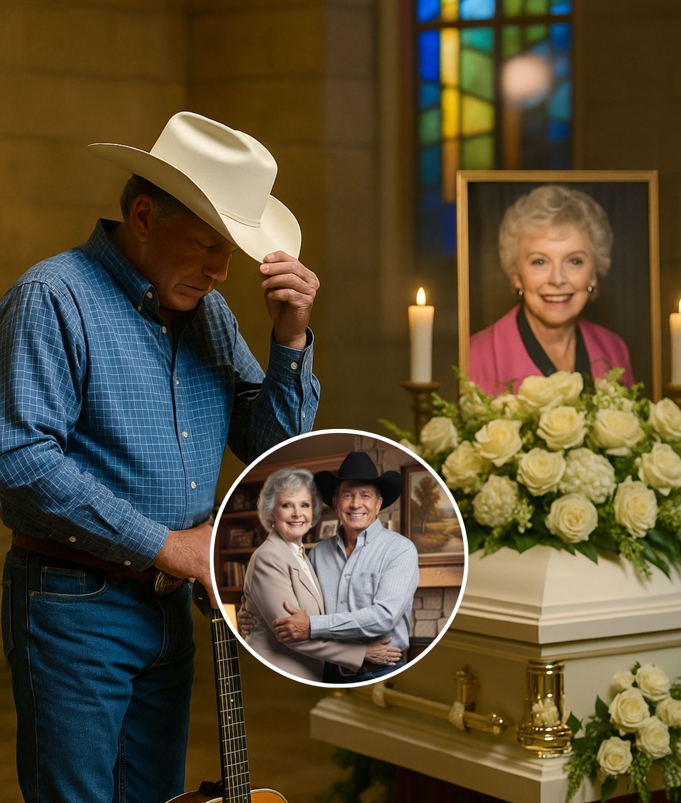 The chapel was hushed — a soft light falling across the pews, the scent of lilies hanging in the air, and a stillness that felt almost sacred. At the front, George Strait stood with his hat pressed gently against his chest, his head bowed in reverence. Before him rested the casket of June Lockhart, the beloved actress whose century-long life had spanned the golden age of Hollywood and the quiet grace of a bygone America.